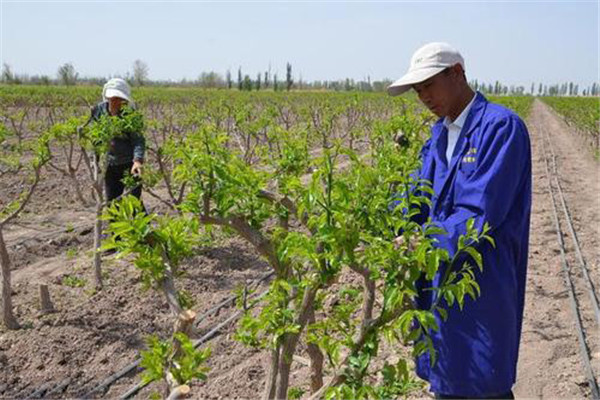 在萌芽前將植株順寬行間用繩拉成與地面成40-60度角,以干背上每隔40厘米,選一方向適宜,芽體飽滿的二次枝進行留樁短截,然后在芽上方1厘米處刻傷,促使傷口下主芽萌發(fā)抽生棗頭。