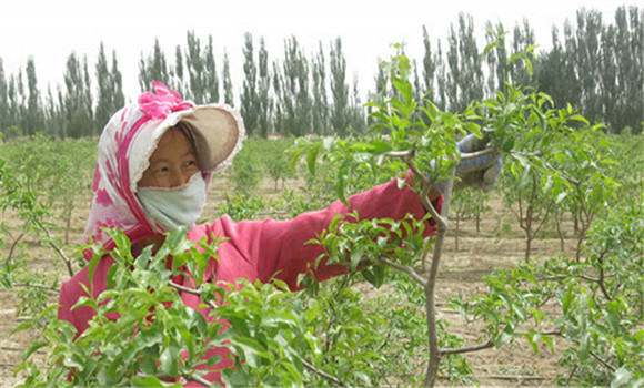 摘心可以控制結(jié)果部位外移,提高花芽飽滿度,小樹摘心可提早成形。一般進行三次,時間為6月上旬左右,對長度在30厘米左右的旺梢摘心;6月下旬至7月上旬對沒有停長的旺梢繼續(xù)摘心;8月下旬至9月上旬剪去主、副梢頂端嫩尖,使枝條發(fā)育充實,提高其熟度。