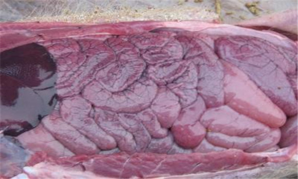 急性期腸壁呈水腫性肥厚,大腸松弛,腸系膜淋巴結(jié)腫脹,腸內(nèi)容物為水樣,惡臭并含有黏液,腸黏膜常附有灰白色纖維素樣物質(zhì),特別在盲腸端出現(xiàn)充血、出血,水腫和卡他性炎癥更為顯著。