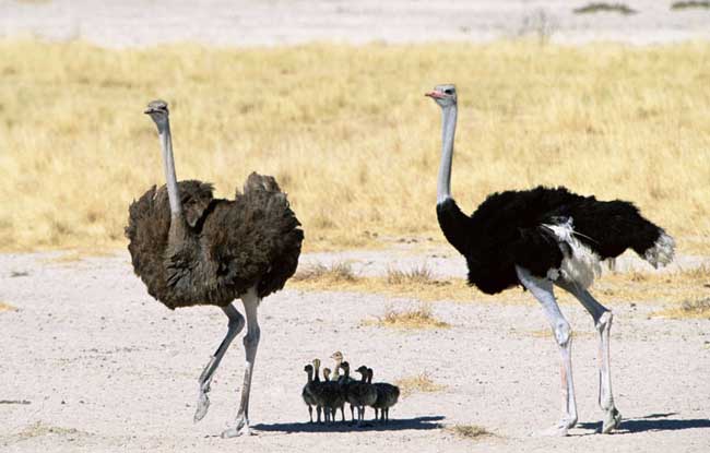 雌鳥較小,兩翼退化,翅羽的功能主要是用來平衡身體,翅羽在寒冷的季節(jié)用來覆蓋無羽毛的大腿以保持體溫及交配時用來求偶發(fā)情,成鳥也常用翅羽來保護幼鳥及穴中的蛋。雌性毛色大致與雄鳥相似,只是毛色棕灰不像雄鳥那么艷麗。幼鳥羽色棕灰斑駁,須經(jīng)數(shù)次換羽,至兩歲時才能達到成鳥的羽色。此毛色主要是為了便于偽裝。兩性幼雛長得非常相像,甚至年輕的鴕鳥也相差很少,到目前為止仍無法從外貌分辨雌雄,只能從性器官去區(qū)別。鴕鳥之骨盆為封閉形,左右恥骨在中線形成瘉合。值得注意的是,鴕鳥的排尿和排糞是分開的,這與其他鳥類不同。